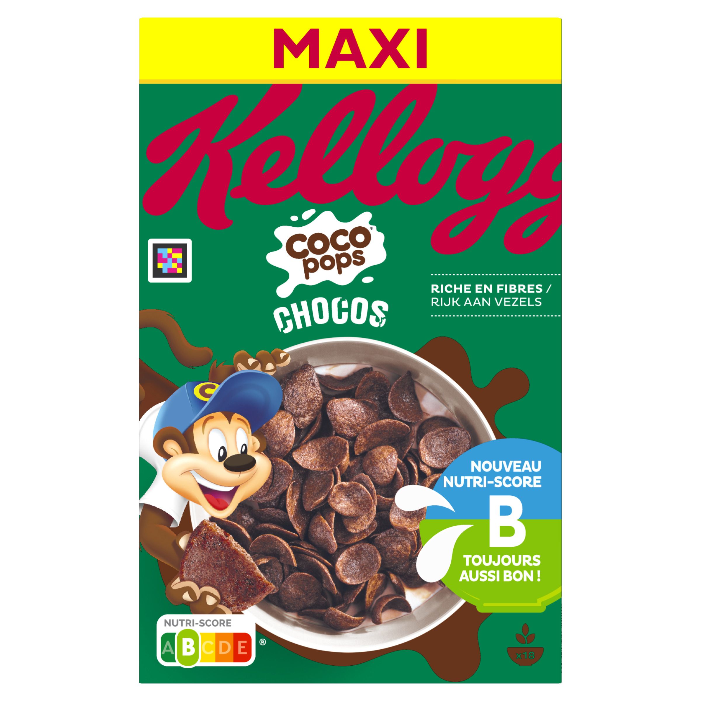 Pour bien commencer la journée, rien de tel qu'un petit déjeuner avec Coco Pops Chocos et son ami Coco, le singe malicieux ! Cocos Pops Chocos sont de délicieuses pétales de blé au bon goût de chocolat de la jungle*. Ces céréales croustillantes rendent le lait délicieusement chocolaté ! Les céréales Coco Pops Chocos ont tout pour bien commencer la journée, au sein d'un petit déjeuner équilibré avec un produit laitier et un fruit : - Une combinaison de glucides, - Riches en vitamines du groupe B et D, - Source de calcium, - Riches en fer. *Le saviez-vous ? C'est dans la jungle chaude et humide que pousse le cacaoyer. Le fruit de cet arbre, la cabosse contient des fèves que l'on peut sécher et broyer pour faire de la poudre de cacao, un ingrédient principal du chocolat.