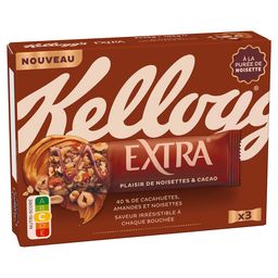 Nouvelle recette de barres de céréales Extra, encore plus gourmande et généreuse, à base de purée de noisettes et de cacao. Pour un moment irrésistiblement savoureux à chaque bouchée !