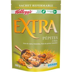 -Kellogg’s a créé : EXTRA Pépites 4 Noix ! Au petit-déjeuner, l’essayer, c’est l’adopter ! Des pépites dorées et croustillantes ! Composées de flocons d’avoine et de blé, ces pépites de céréales sont lentement grillées au four afin d’obtenir une texture croustillante et une belle couleur dorée. De délicieuses noix ! Les plus belles pépites sont ensuite soigneusement sélectionnées avant d’être associées à de délicieuses noix de cajou, noisettes, noix de pécan et amandes. Pépites d'avoine croustillantes avec des noix de cajou, noisettes, noix de pécan et amandes, enrichies en vitamines (B1, B2, Niacine, B6, Acide folique, B12) et en fer