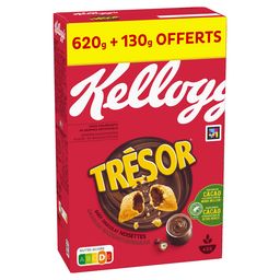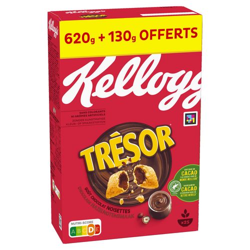 Avec Trésor de Kellogg's, libérez le Chocovore qui sommeille en vous ! Trésor de Kellogg's, tout le plaisir d'une céréale croustillante avec un cœur fondant au bon goût de Chocolat Noisettes. Délicieusement bon, retrouvez les céréales Trésor dès le petit-déjeuner, accompagné de lait et d'un fruit frais. Retrouvez dès maintenant au rayon petit-déjeuner les goûts: Chocolat Noisettes, Chocolat au Lait, Duo Choco, Choco Roulette ou encore le nouveau goût Cookies & Cream . Découvrez aussi Snax & Stix, des formats parfaits au goûter ! Un Trésor Snax ou Stix et un fruit : un goûter équilibré à savourer. Sans arômes ni colorants artificiels.