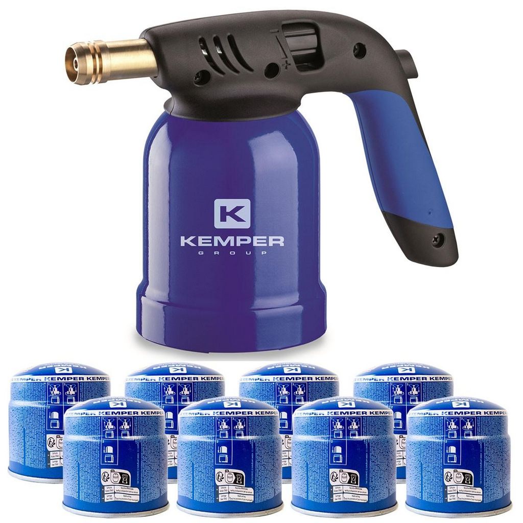 Lampe a souder Coque Acier allumage piezo + 8 Cartouches de gaz 190gr STOP GAZ Perçables KEMPER