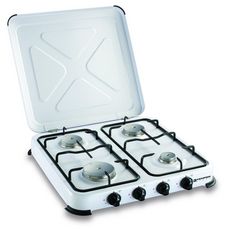 Plaque de cuisson gaz 4 feux et 4.65kW. Doté d'un brûleur en inox, d'une grille et d'un couvercle amovible de protection. Fonctionne au gaz butane ou propane. Connectique tétine (tuyau et détendeur non inclus). Non compatible avec le gaz de ville.