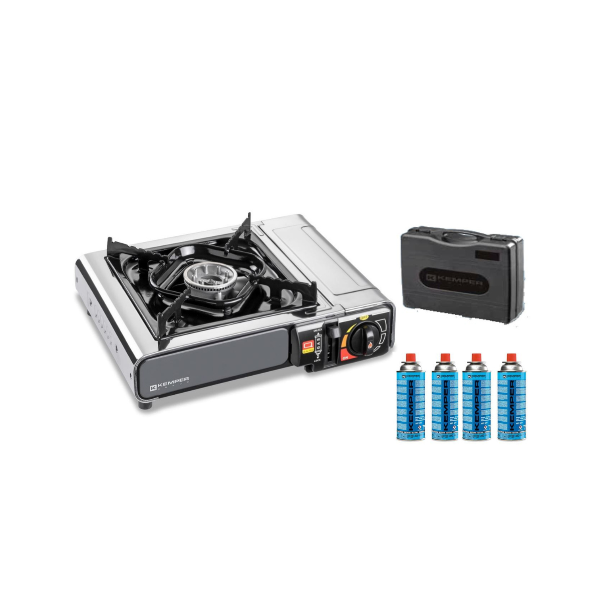 Réchaud à gaz 2200W INOX + 4 cartouches de gaz 190g KEMPER