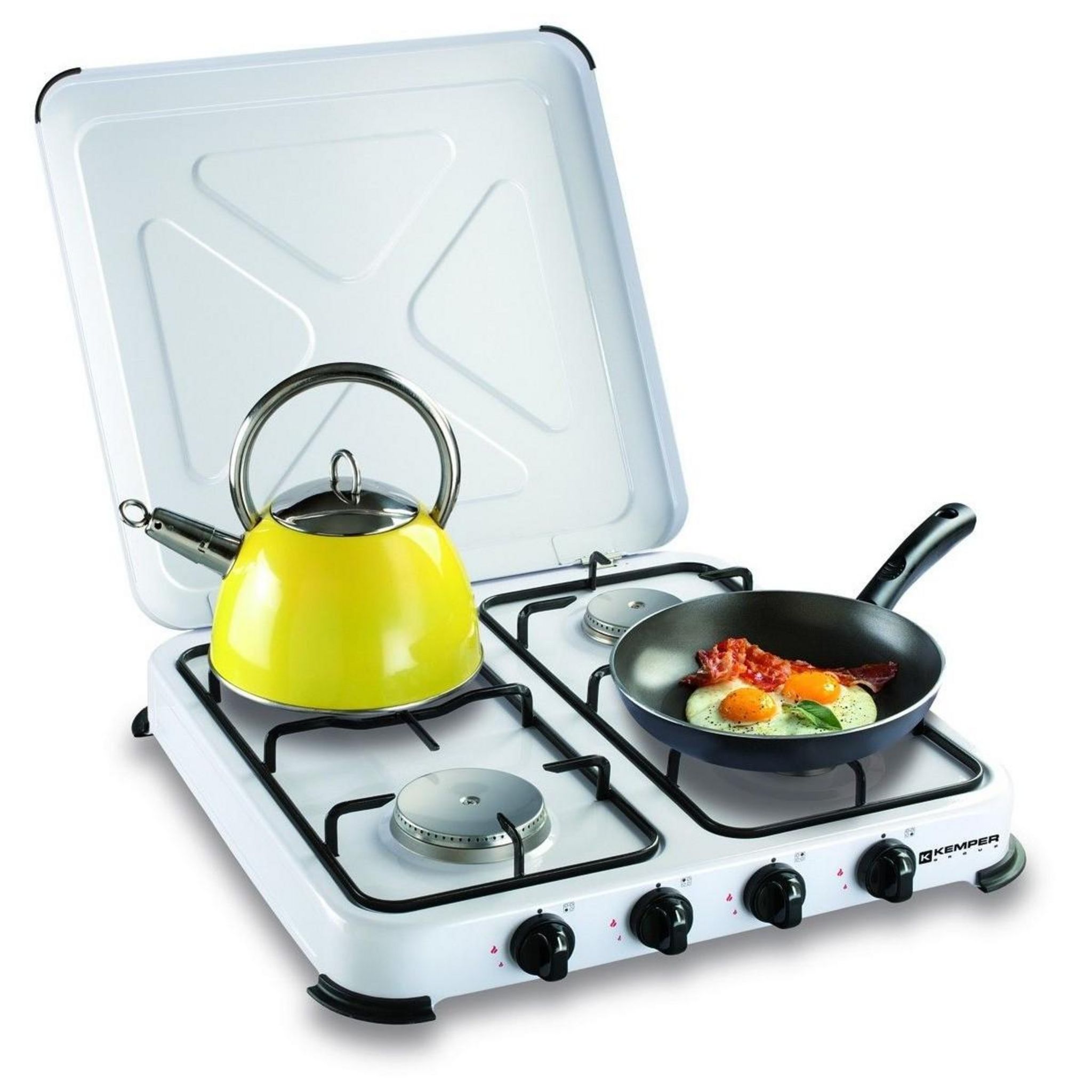 Réchaud gaz portable 4 feux 4650W Blanc laqué Couvercle KEMPER