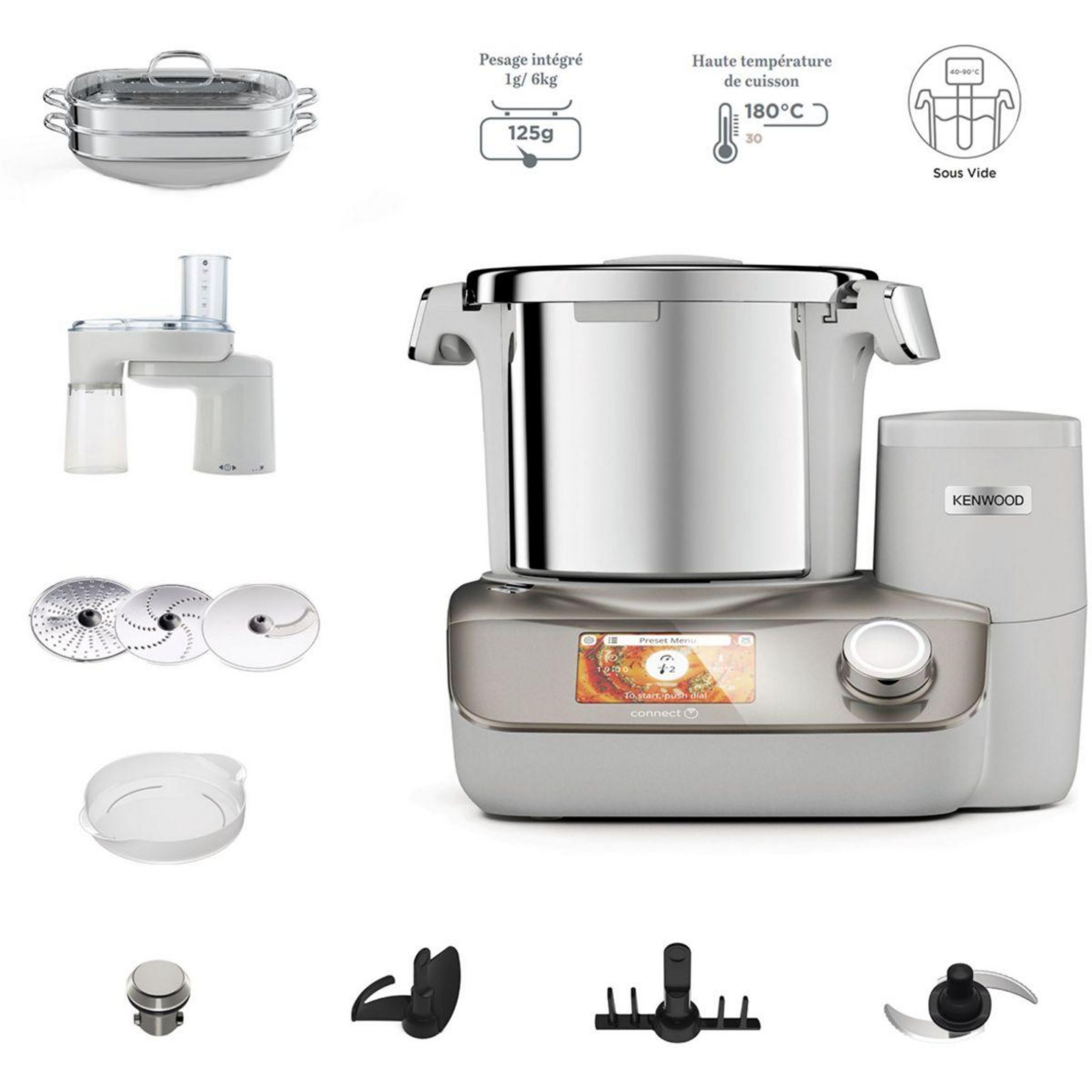 Livré avec | Livre de recettes, adaptateur fond plat, disque(s) éminceur, disque(s) râpeur, emulsionneur, mélangeur, panier de cuisson, panier vapeur, plateau de pesage, poussoir, spatule |