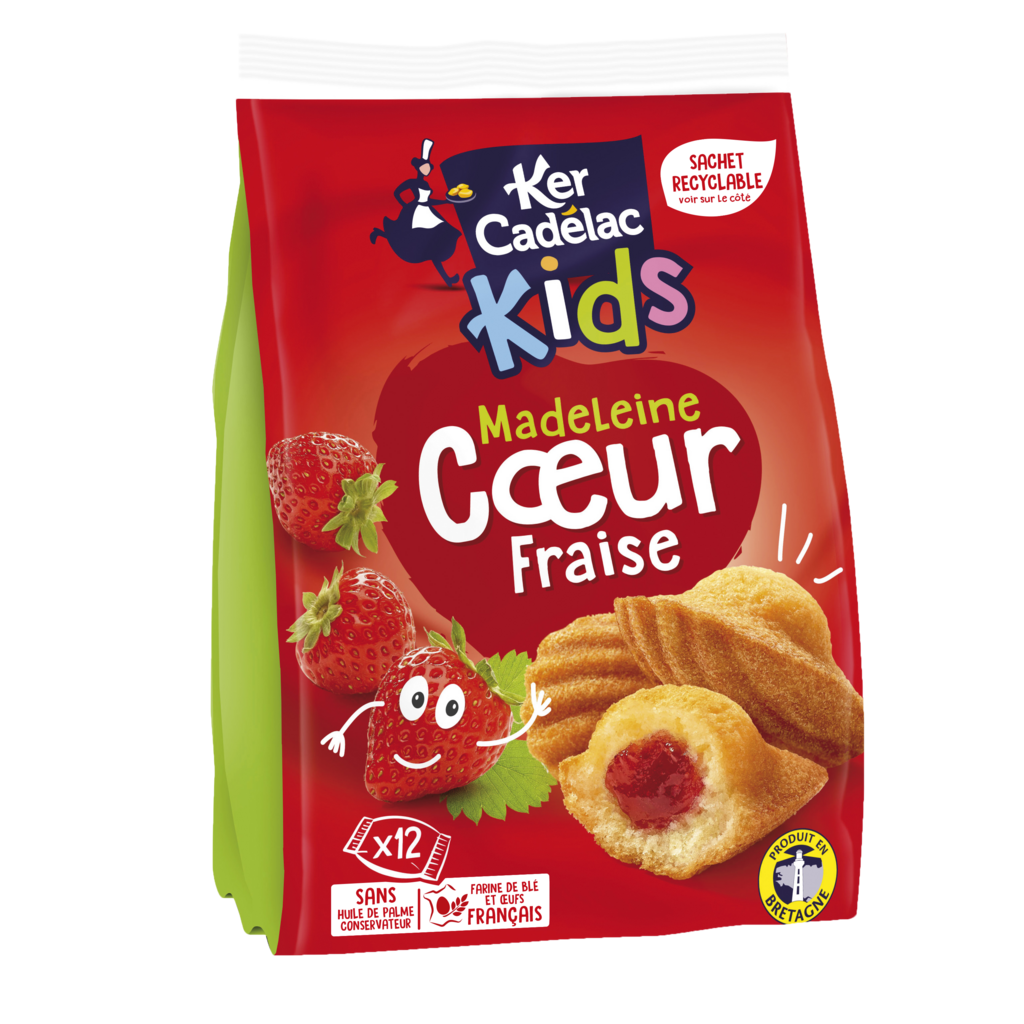 De vraies madeleines avec un cœur gourmand, pour le plus grand plaisir des enfants … et des parents ! Des ingrédients simples, des madeleines sans huile de palme ni conservateur, réalisées avec de la farine de blé français et de bon œufs frais, pour rassurer les mamans. Une recette gourmande avec un cœur fraise délicieusement fruité pour plaire aux enfants. Et des packagings ludiques avec des jeux sur l’emballage individuel de chaque madeleine (30 jeux différents à découvrir !). Madeleine fourrée saveur fraise