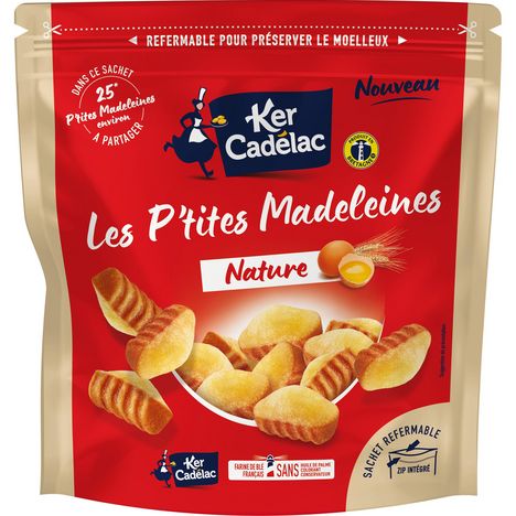 Les Ptites Madeleines Ker Cadélac : un concept inédit ! Une recette gourmande et une texture moelleuse le tout dans un sachet fraîcheur pratique de la farine de blé français, sans huile de palme, sans colorant ni conservateur. Un emballage pratique qui s'ouvre et se referme grâce à son Zip et qui permettra de conserver la fraîcheur des madeleines. 25 madeleines natures dans le format 412g.
