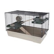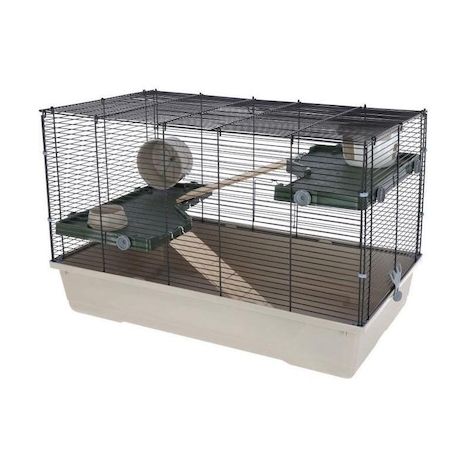 Entierement équipée avec maisonnette, gamelle (120 ml) et roue d'exercice (Ø de 14 cm), cette cage offre suffisamment d'espace grâce a la répartition sur 3 étages. Des escaliers en bois facilitent l'acces aux étages supérieurs, et des clips supplémentaires dans les coins assurent une stabilité accrue. Deux grilles (12,5 x 12,5 cm chacune) en haut et sur le côté facilitent le prélevement des animaux.