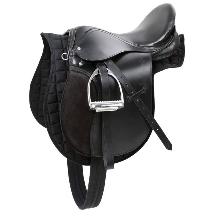 L'ensemble comprend une selle, un tapis de selle, des etriers, des ceintures d'etriers et une sangle de selle.