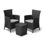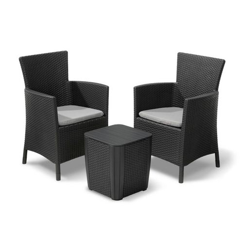 Keter 12-139890 Profitez de votre extérieur grâce à cet ensemble de balcon en résine synthétique.Conçu pour les petits espaces, il s'intégrera facilement sur votre balcon. Un aspect moderne grâce à sa couleur anthracite.Un confort optimal en vous proposant des coussins moelleux mais aussi des dossie