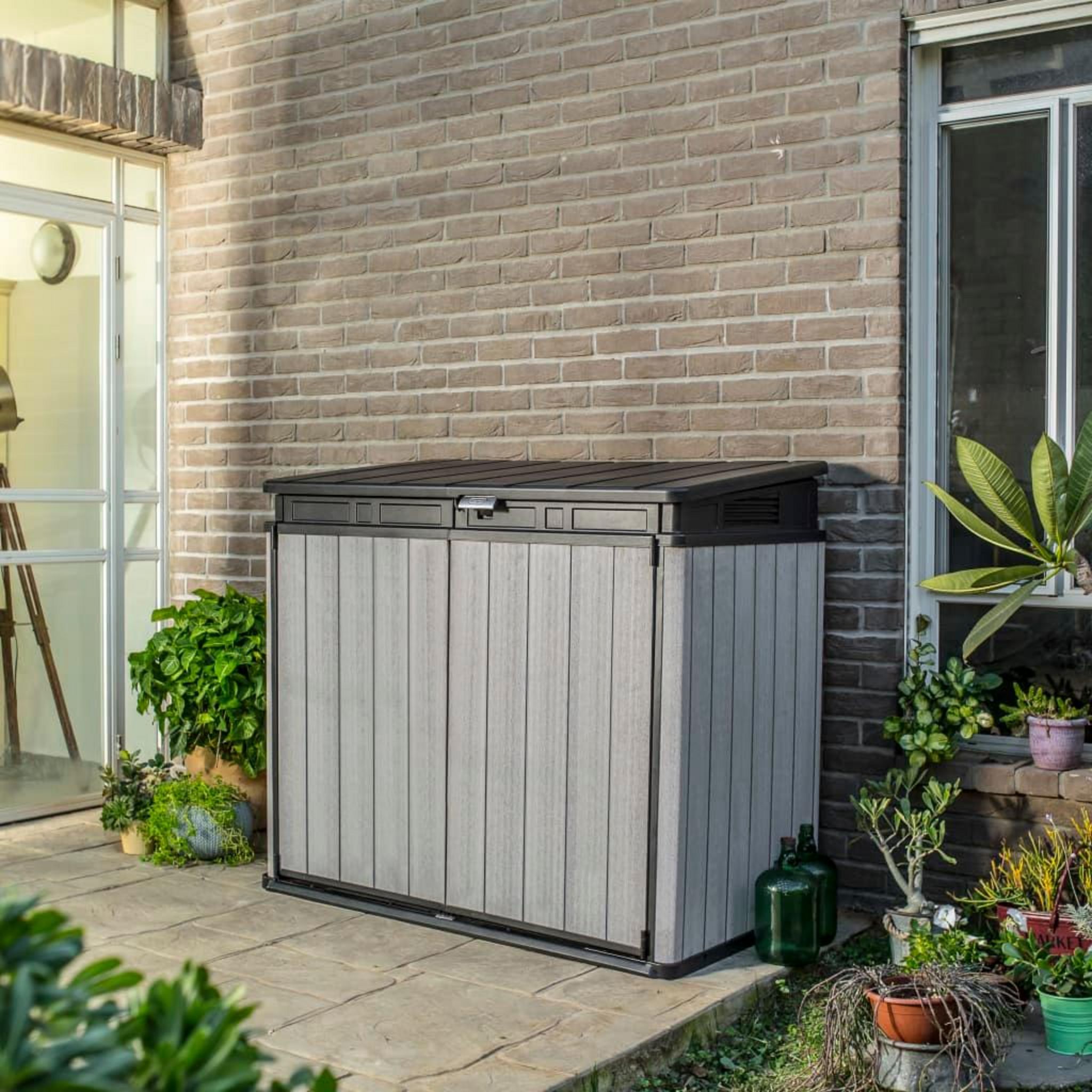 L'abri peut etre ouvert via ses deux portes et son couvercle grace aux verins a gaz pratiques. Il a une capacite totale de 1 200 litres. L'Elite Store est fabrique en materiau innovant DUOTECH, un polypropylene de haute qualite, durable, ne necessitant aucun entretien et resistant aux intemperies. Il a ete dote d'une structure de grain de bois attrayante et peut etre peint dans la couleur de votre choix pour l'harmoniser avec le decor de votre espace de vie exterieur.