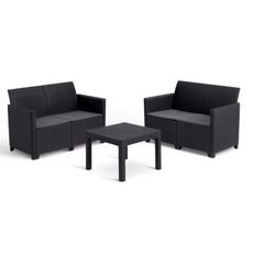 Le salon de jardin MARIE de KETER est modulable pour 4 personnes. Choisissez entre 2 canapés 2 places ou un canapé 3 places avec un fauteuil. Inclus : table basse et coussins. Fabriqué en résine résistante aux intempéries, facile a entretenir et avec protection anti-UV.