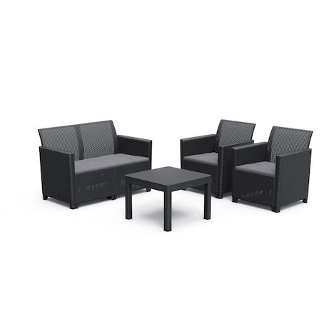 Le salon de jardin MARIE de KETER en résine imitation rotin tressé noir est parfait pour 4 personnes. Il comprend une banquette 2 places, 2 fauteuils avec coussins et une table basse. Fabriqué en Europe, il est résistant aux intempéries et facile a entretenir. Garantie 2 ans.