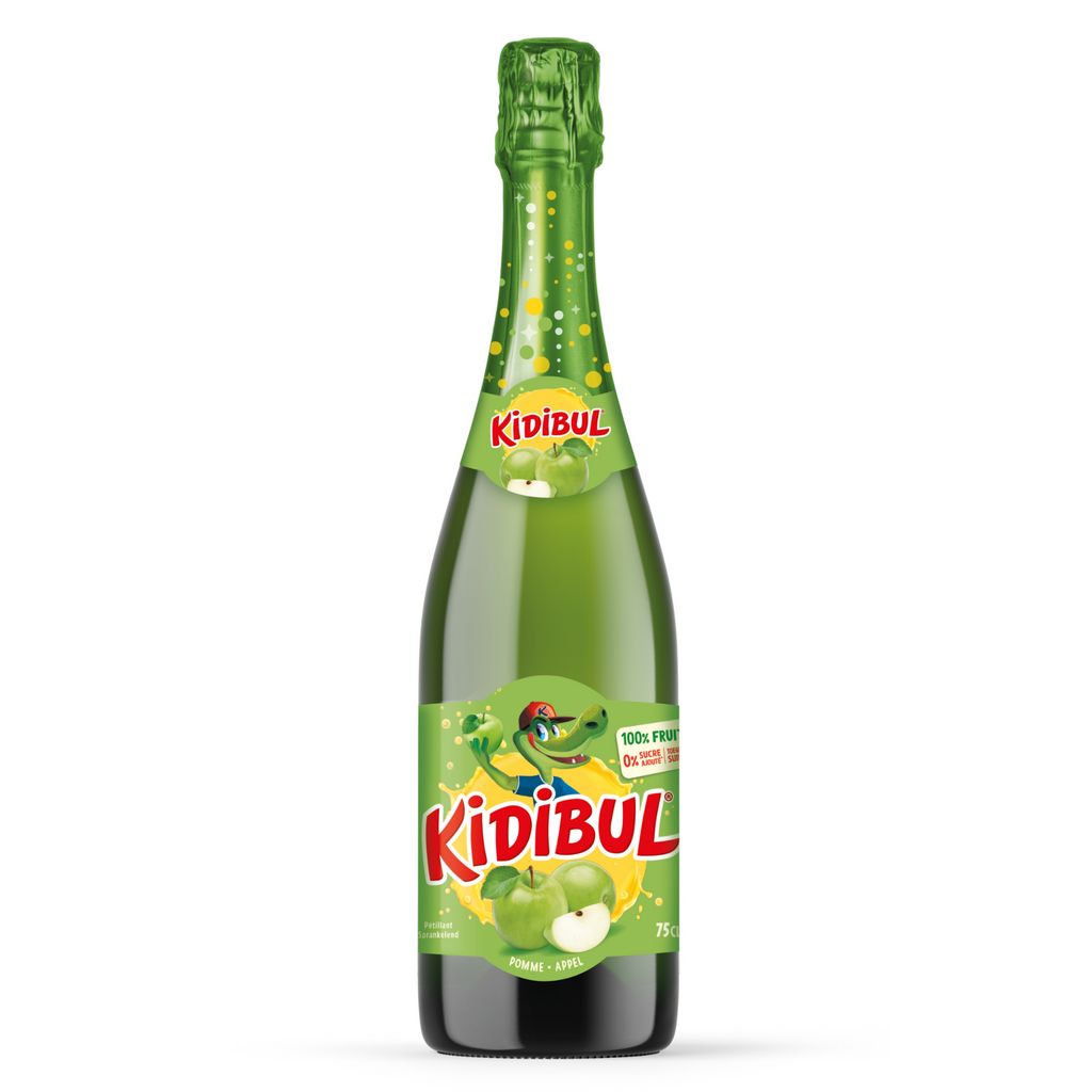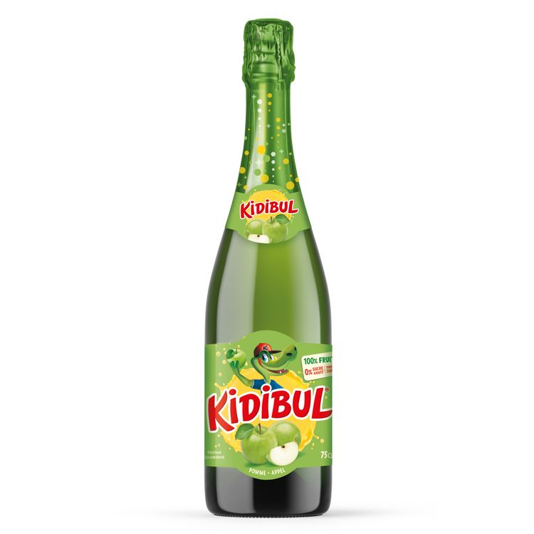 La marque KIDIBUL et sa mascotte crocodile présente Kidibul Pomme une boisson pétillante, 100% jus de fruits, sans sucre ajouté, sans colorant ni conservateur. Il faut l'équivalent du jus de 6 belles pommes pour faire une bouteille de Kidibul. Kidibul, c'est… 0 colorant ni conservateur : la couleur de Kidibul, c'est celle des fruits ! 0 sucre ajouté : contrairement aux autres sodas et boissons gazeuzes, il n'y a pas de sucre ajouté dans Kidibul, uniquement les sucres naturels qui se trouvent dans les fruits.
