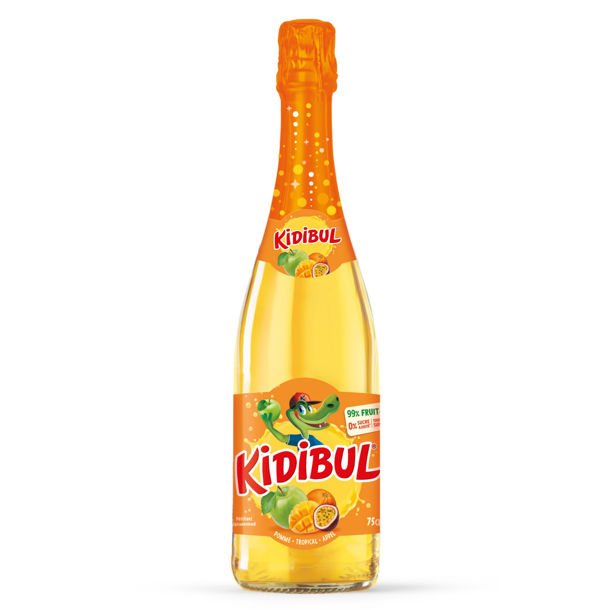 La marque KIDIBUL et sa mascotte crocodile présente Kidibul Pomme-Tropical une boisson pétillante, 100% jus de fruits, sans sucre ajouté, sans colorant ni conservateur. Il faut l'équivalent du jus de 6 belles pommes pour faire une bouteille de Kidibul. Kidibul, c'est… 0 colorant ni conservateur : la couleur de Kidibul, c'est celle des fruits ! 0 sucre ajouté : contrairement aux autres sodas et boissons gazeuzes, il n'y a pas de sucre ajouté dans Kidibul, uniquement les sucres naturels qui se trouvent dans les fruits.