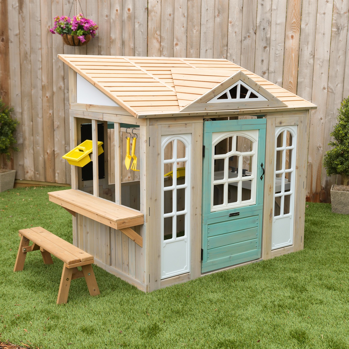 Si vous cherchiez un moyen d'occuper vos enfants toute la journée, cette maisonnette Meadowlane Market de KidKraft est faite pour vous. Une porte d'entrée de couleur bleue les accueille dans cette structure unique entre maisonnette et cabane de jardin. À l'intérieur, une cuisinière et un évier leur permettent de laver les aliments en vue de servir de délicieuses collations via la fenêtre passe-plat, à laquelle viennent s'adjoindre une table et un banc.