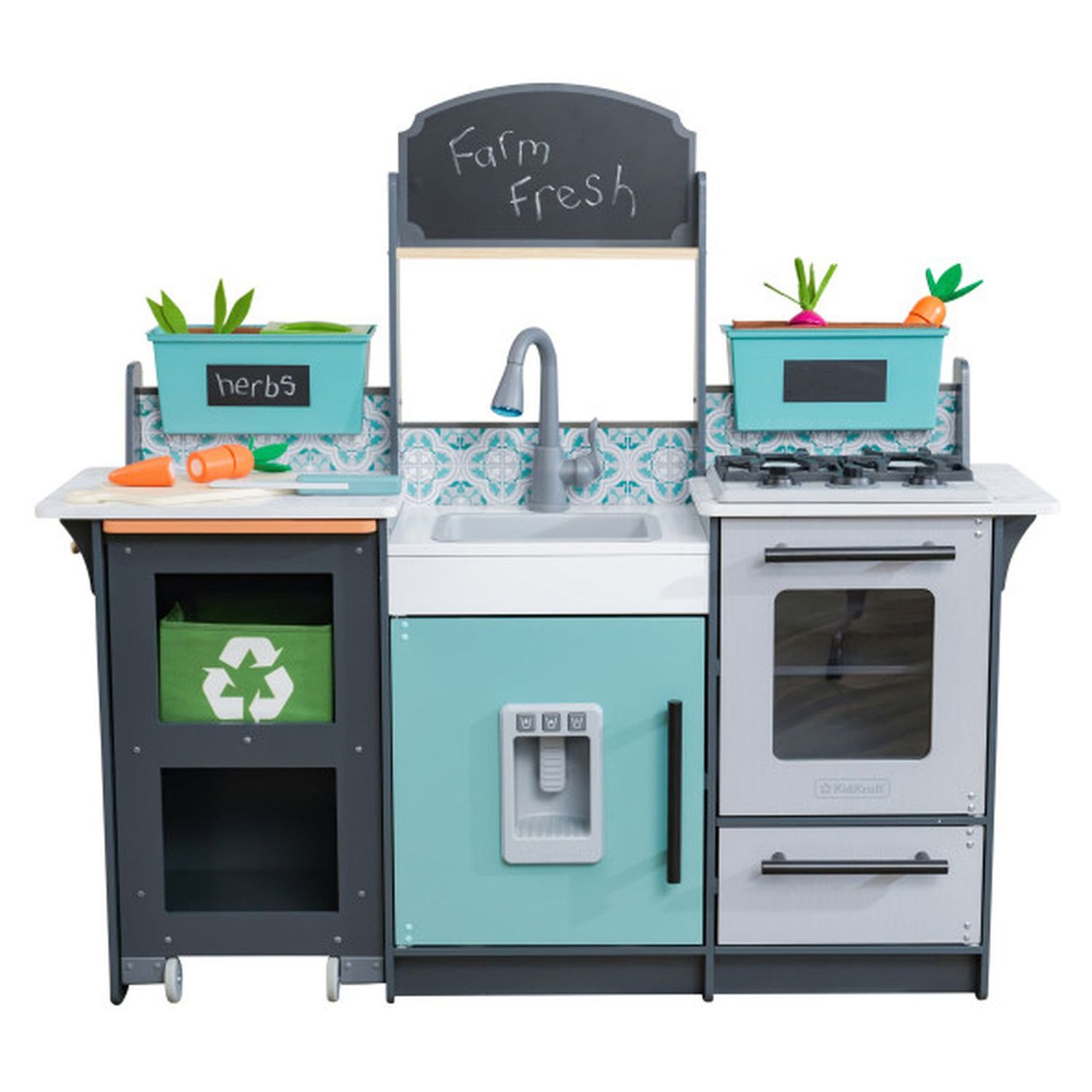 La cuisine Garden Gourmet va plaire aux petits cuisiniers qui vont stimuler leur imagination en imaginant des mets délicieux.De la ferme à l'assiette : les bons petits plats sont mis à l'honneur avec la cuisine pour enfants Garden Gourmet de KidKraft. Des pièces haut de gamme : plans de travail imitation marbre, crédence haute en couleur façon carrelage et desserte en bois style billot de cuisine sont mises en valeur dans un décor rustique qui évoque l'élégance des fermes d'aujourd'hui. Vos enfants adoreront cuisiner avec des légumes et des aromates qu'ils pourront « cueillir » et « hacher » pour les ajouter à leurs repas les plus créatifs. Avec des boutons qui se tournent et cliquent, une machine à glaçons qui produit des glaçons factices avec un vrai son, l'expérience culinaire semble encore plus réelle. Une poubelle de recyclage en tissu est là pour rappeler aux enfants combien la protection de l'environnement est importante. Des tableaux noirs permettent aux plus jeunes d'exprimer leur créativité artistique et d'ajouter une touche personnelle à cette adorable cuisine où la magie ne manquera pas d'opérer. Cuisine avec un robinet lumineux et sonore.Les petits chefs raffoleront de leur cuisine et pourront imiter les grands en jouant à faire la cuisine.La technologie innovante EZ Kraft Assembly permet un montage plus rapide. Ainsi, vous passez moins de temps à l'installer et vos enfants ont plus de temps pour s'amuser !