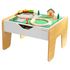 Le dessus réversible de la table comporte une surface décorée sur un côté et une surface pour la construction de briques. Elle comprend 200 briques de construction et 30 pièces en bois de train afin que nos petits ingénieurs en herbe puissent réaliser leurs premières créations. Lorsque les enfants ont fini de jouer, le dessus se relève pour découvrir l’espace de rangement.
