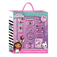 Un coffret 34 pièces d'accessoires cheveux et bijoux à l'effigie du dessin animé Gabby's Dollhouse. Composé d'une belle parure de bijoux : 1 collier de perles avec charms coeur, 1 bracelet de perles avec charms coeur, 2 bagues coeur. Egalement de nombreux accessoires cheveux : serre tête, brosse à cheveux, barrettes papillons à paillettes, différentes barrettes clic-clac et élastiques à cheveux pour se faire belle comme son héroïne préféré.