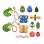 Attrapez le plus d'insectes à l'aide de votre canne à pêche aimantée en forme de grenouille. Votre enfant découvre en s'amusant l'environnement de la mare : coccinelle, abeilles, papillons, vers de terre et autres petits insectes. Inclus dans le jeu : 2 cannes à pêche aimantée, 11 figurines à attraper.