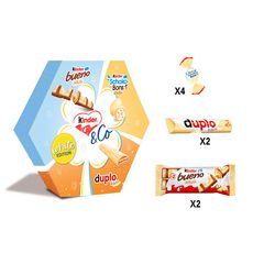 KINDER BUENO WHITE: Fines gaufrettes enrobées de chocolat blanc et d'éclats de cacao (6,5%), fourrées lait et noisettes broyées. SCHOKOBONS: Bonbons de chocolat blanc avec fourrage au lait (42,5%) et éclats de noisettes. DUPLO: Gaufrettes enrobées de chocolat blanc avec fourrage noisette.