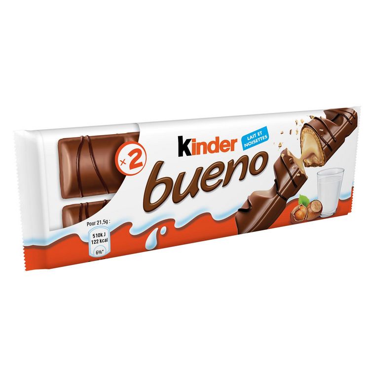 KINDER BUENO c'est une barre délicieusement chocolatée au bon cœur au lait et aux noisettes. Croustillant, fondant, irrésistible... Faites-vous vraiment plaisir.