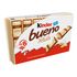 KINDER BUENO WHITE : Fines gaufrettes enrobées de chocolat blanc et de pépites au cacao (6,5%), fourrées lait et noisettes broyées
