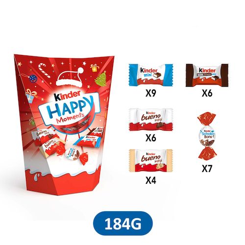 Kinder Happy Moments arrive en format ballotin et se fait tout beau pour Noël avec un nouveau design festif imaginé spécialement pour les grands gourmands. Partagez ce mix de vos minis Kinders préférés avec vos proches et vos amis pour rendre le moment encore plus festif et délicieux. Composition : 9 Kinder Chocolat Mini, 6 Kinder Mini Dark&Mild, 6 Kinder Bueno Mini, 4 Kinder Bueno White Mini, 7 Kinder Schoko-Bons.