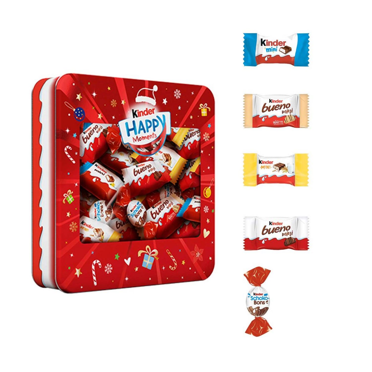 KINDER HAPPY MOMENTS 347G : Assortiment de fines gaufrettes et barre céréalière enrobées de chocolat, et de bonbons de chocolat Pour les grands gourmands, un mélange de mini bouchées Kinder dans un format idéal à partager. Il y aura pour tous les goûts avec l’assortiment de Kinder Maxi Mini, Kinder Schoko-Bons, Kinder Country mini, Kinder Bueno Mini, Kinder Bueno white mini.
