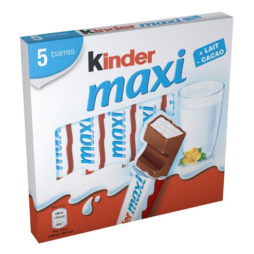 KINDER MAXI : Chocolat supérieur au lait avec fourrage au lait Kinder Maxi, c'est la barre au goût unique de chocolat Kinder que je connais depuis toujours. Retrouvez le temps d’une pause l’insouciance de votre enfance, en taille adulte !