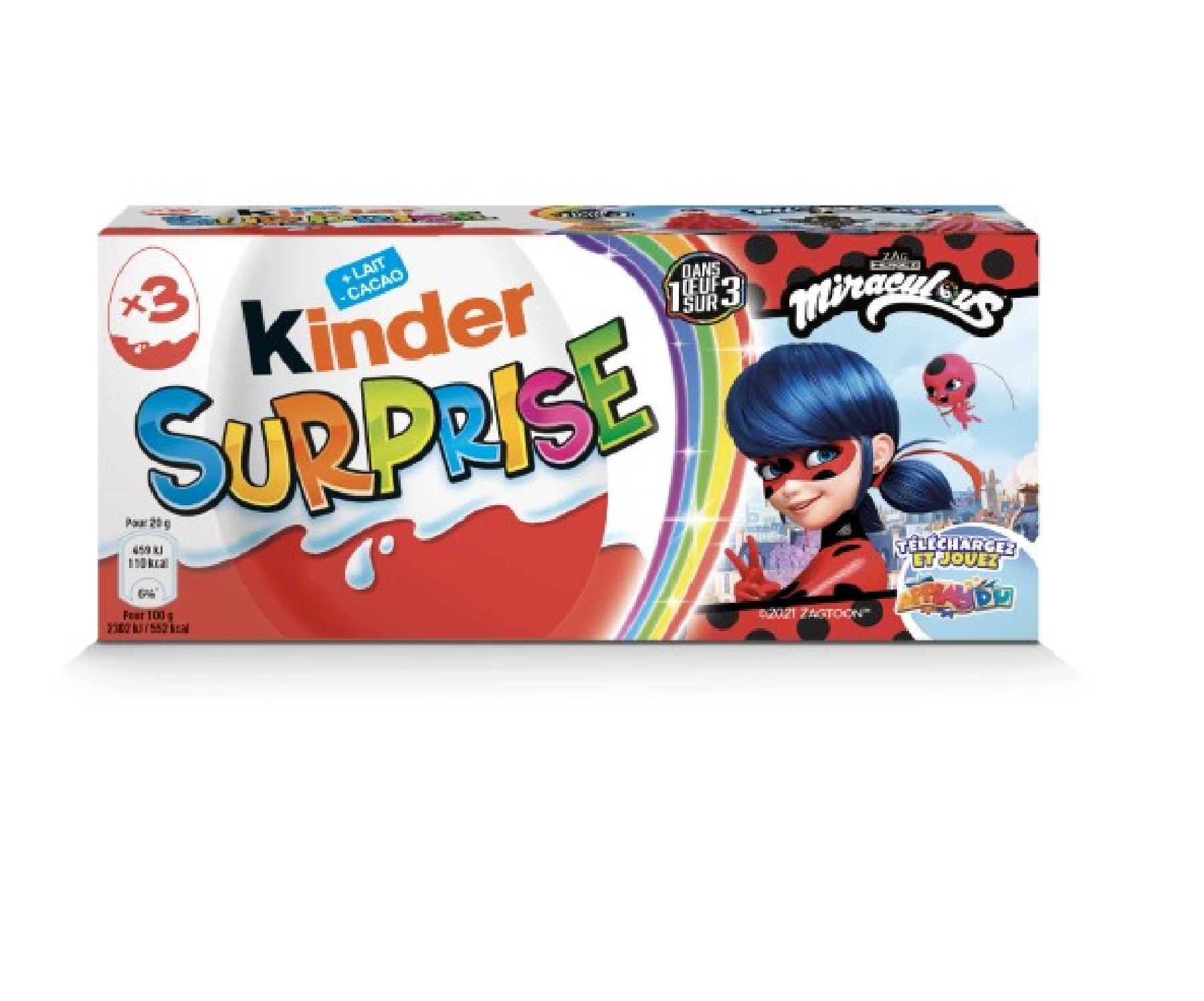 KINDER SURPRISE : Confiserie recouverte de chocolat supérieur au lait contenant une surprise dans une capsule plastique
