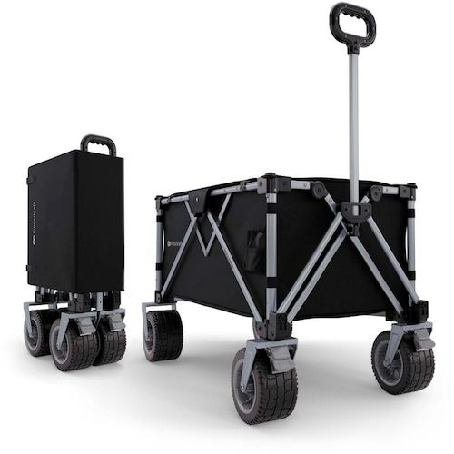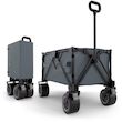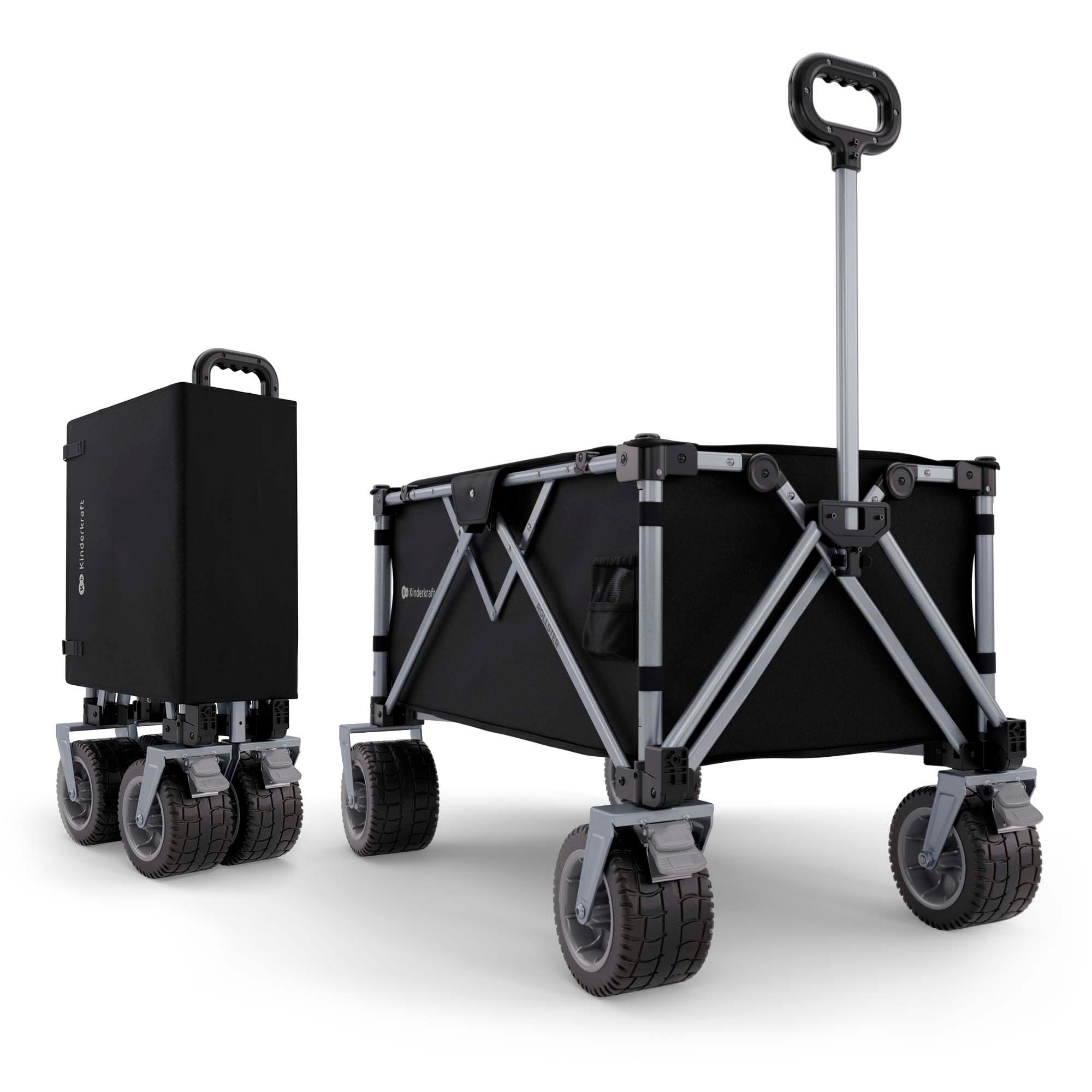 Les roues tout-terrain de 10 cm de large permettent de rouler sans effort sur le sable, l'herbe, le gravier ou les chemins non pavés. Grâce aux roues avant pivotantes avec fonction de rotation à 360° et blocage des roues, vous gardez un contrôle total, même sur un terrain accidenté. La barre de poussée télescopique réglable permet d'ajuster facilement le chariot à votre taille pour un confort de conduite optimal.