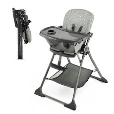 Elle se plie de manière compacte, idéale pour les voyages. Grâce à ses nombreuses options de réglage (3 positions de dossier, 2 repose-pieds), elle s'adapte à la taille de l'enfant pour garantir une posture confortable. Le plateau ajustable sur 3 positions offre un confort optimal pendant les repas.