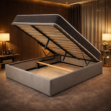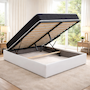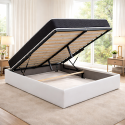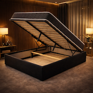 Le sommier à lattes multiplis garantit un excellent soutien du matelas et une bonne ventilation pour un confort optimal nuit après nuit. Grâce à son système de vérins hydrauliques, le sommier se relève facilement pour accéder à un grand coffre de rangement intégré, idéal pour optimiser l'espace de la chambre.