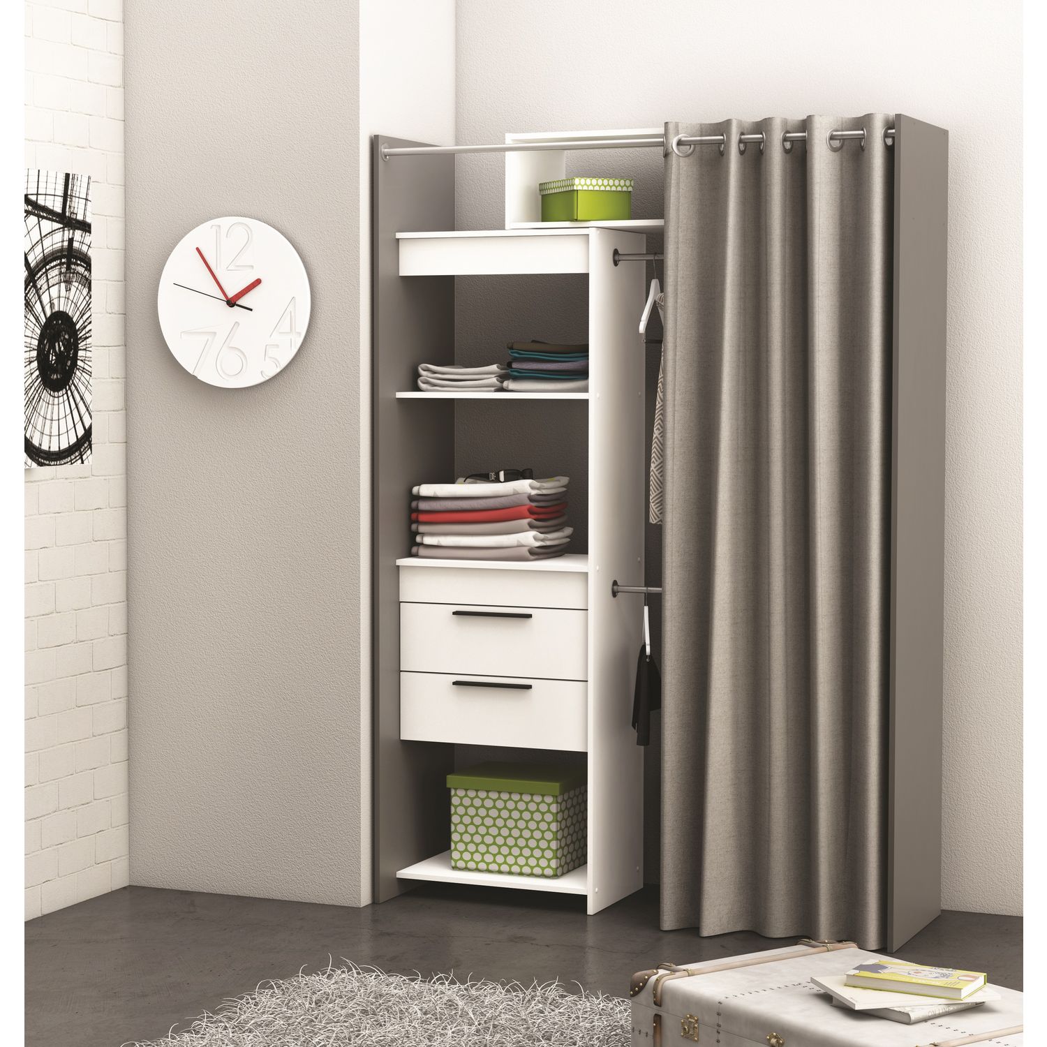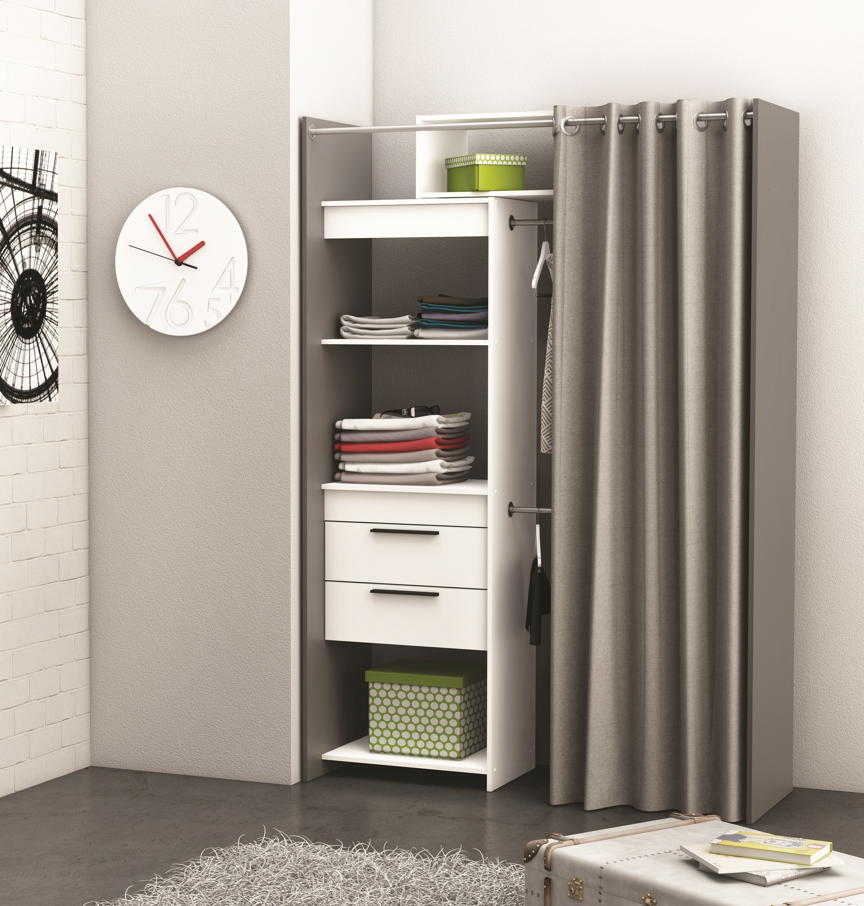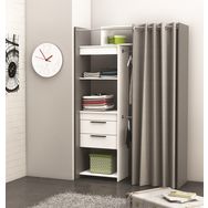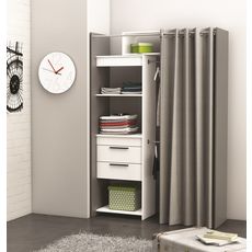 Optez pour ce kit dressing de la gamme Dressit. En plus d'être pratique avec ses nombreuses étagères, ses tiroirs et sa double penderie, il est extensible ! Ce qui vous permettra d'adapter ce kit à votre pièce à coup sur. Un rideau est également vendu avec ce kit dressing, pour pouvoir cacher vos vê