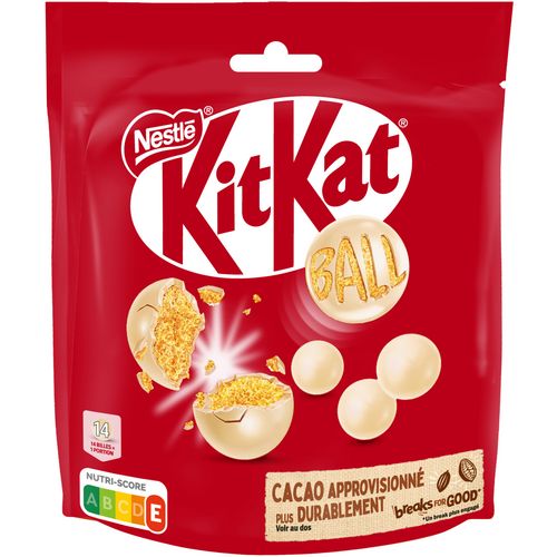 KITKAT® Ball, ce sont des billes de chocolat blanc (44%) au coeur de céréales croustillantes (19%) enrobées de crème confiseur (35,9%). A la fois croustillantes et fondantes, ces billes à partager sont idéales pour tous ceux qui aiment faire un bon break* ! La portion repère est de 10 billes de KITKAT® Ball. Existe au chocolat au lait. La marque KITKAT® est née en Angleterre en 1935. Depuis, KITKAT® est devenue une barre iconique avec 6 milliards de barres vendues dans le monde par an. Important : les jeunes enfants (moins de 4 ans) ont des capacités de mastication limitées et peuvent s'étouffer avec des confiseries de petite taille. HAVE A BREAK, HAVE A KITKAT®**. *Une pause. **Un break, un KITKAT®.