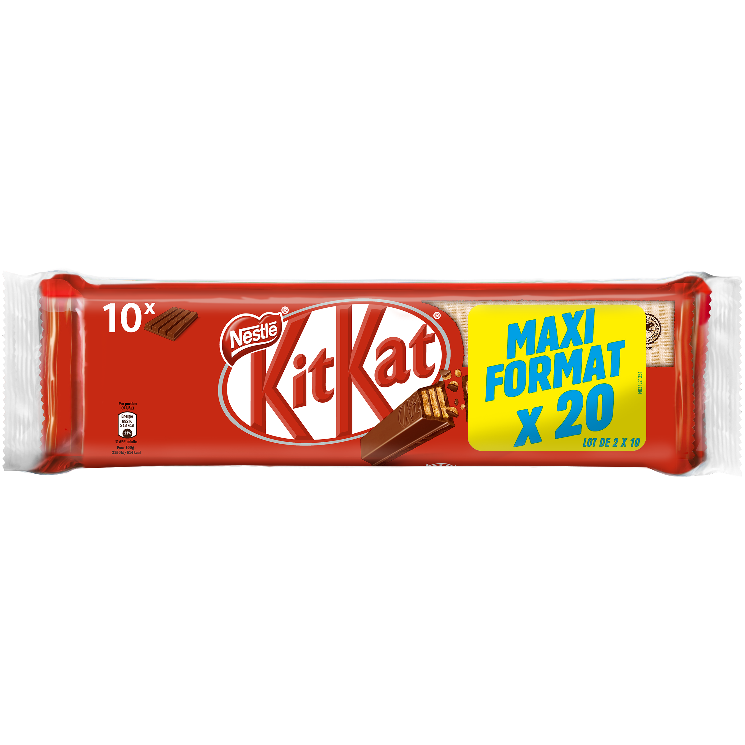 Gaufrette croustillante enrobée de chocolat au lait (68,2%) La barre chocolatée KITKAT est la barre idéale pour tous ceux qui aiment faire un bon break* ! Une gaufrette croustillante à la texture légère dorée au four et un délicieux chocolat au lait. Déballez votre KITKAT, détachez les deux barres puis coupez l'une en deux et dégustez votre break* ! La portion repère est de 4 barres. Existe en plusieurs formats. KITKAT est la première marque internationale à atteindre l'objectif d'achat de 100% de cacao produit de façon durable, dans le cadre du Plan Cacao NESTLE. La marque KITKAT est née en Angleterre en 1935. Depuis, KITKAT est devenue une barre iconique avec 6 milliards de barres vendues dans le monde par an. HAVE A BREAK, HAVE A KITKAT**. *Une pause. **Un break, un KITKAT.