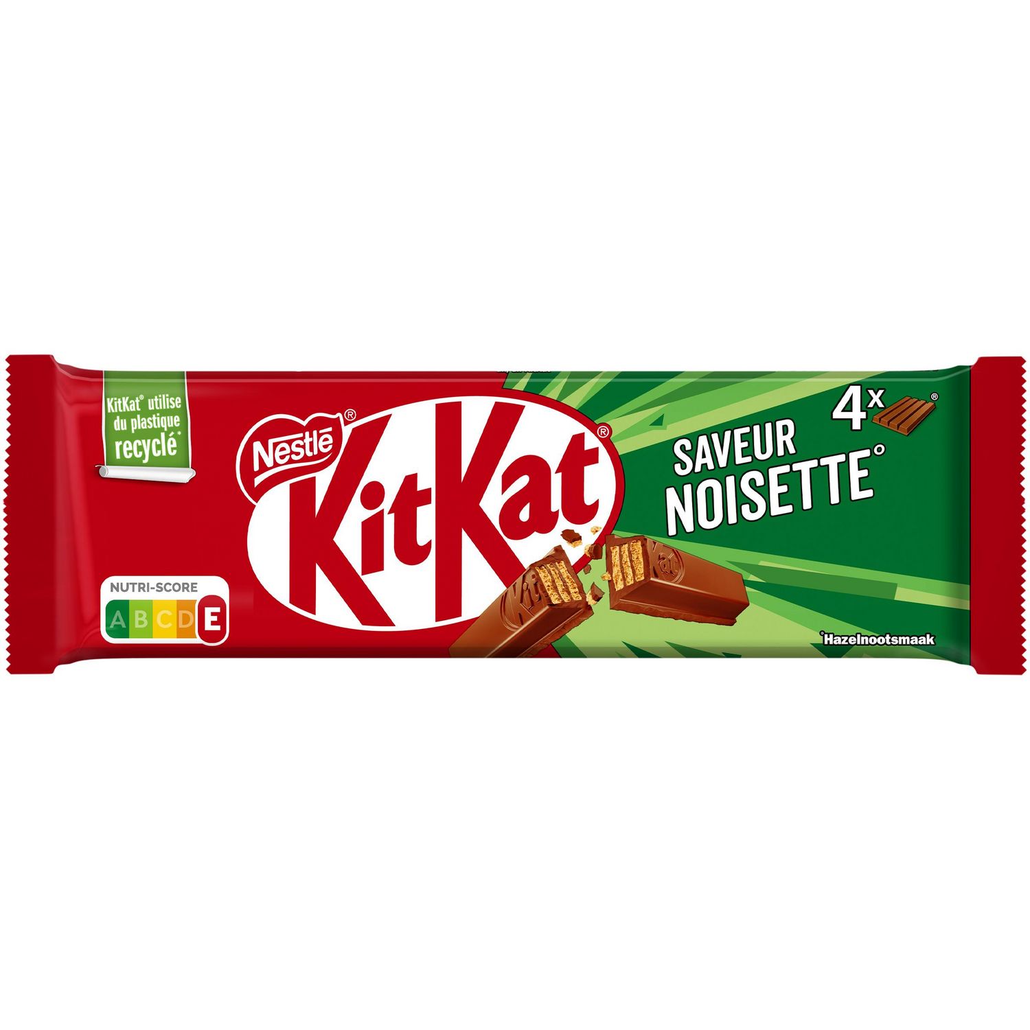 La barre au chocolat KITKAT® saveur noisette est la barre idéale pour tous ceux qui aiment faire un bon break* ! Savourez la gaufrette croustillante à la texture légère dorée au four avec un délicieux chocolat au lait saveur noisette. Déballez votre barre au chocolat KITKAT®, détachez les deux barres puis coupez l'une en deux et dégustez votre break* ! La portion repère est de 4 barres. Existe en plusieurs formats. Cacao approvisionné plus durablement : Pour soutenir une production plus durable du cacao, Nestlé achète une quantité de cacao certifiée Rainforest Alliance équivalente à celle nécessaire pour ce produit. www.ra.org/fr. HAVE A BREAK, HAVE A KITKAT**. *Une pause. **Un break, un KITKAT®.