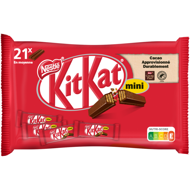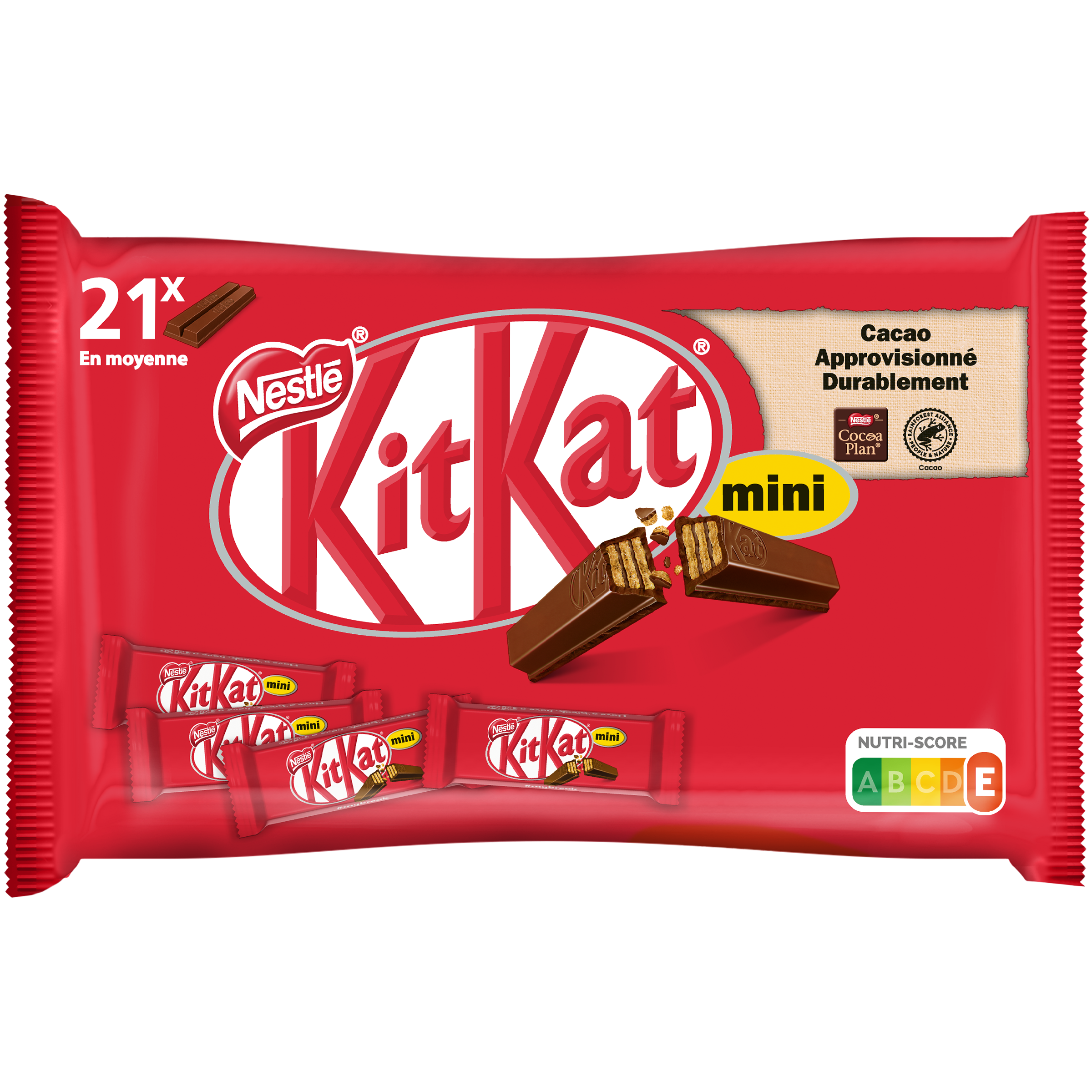 Gaufrette croustillante enrobée de chocolat au lait (68,4%) La barre chocolatée KITKAT Mini est la barre idéale pour tous ceux qui aiment faire un bon break* ! Une gaufrette croustillante à la texture légère dorée au four et un délicieux chocolat au lait. KITKAT Mini c’est la recette originale de KITKAT déclinée en format mini. Déballez votre KITKAT Mini, détachez les deux barres, cassez l'une en deux et dégustez votre break* ! La portion repère est d’un KITKAT Mini. KITKAT est la première marque internationale à atteindre l'objectif d'achat de 100% de cacao produit de façon durable, dans le cadre du Plan Cacao NESTLE. HAVE A BREAK, HAVE A KITKAT**. *Une pause. **Un break, un KITKAT.