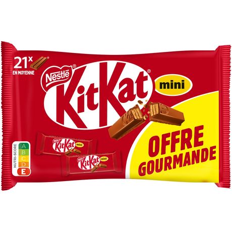La barre chocolatée KITKAT Mini est la barre idéale pour tous ceux qui aiment faire un bon break* ! Une gaufrette croustillante à la texture légère dorée au four et un délicieux chocolat au lait. KITKAT Mini c'est la recette originale de KITKAT déclinée en format mini. Déballez votre KITKAT Mini, détachez les deux barres, cassez l'une en deux et dégustez votre break* ! La portion repère est d'un KITKAT Mini. KITKAT est la première marque internationale à atteindre l'objectif d'achat de 100% de cacao produit de façon durable, dans le cadre du Plan Cacao NESTLE. HAVE A BREAK, HAVE A KITKAT**. *Une pause. **Un break, un KITKAT.