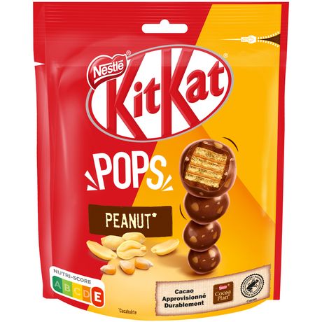 KITKAT POPS Peanut*, ce sont des billes extra gourmandes : la gaufrette KITKAT enrobée de chocolat au lait (54,5%), fourrée d'une délicieuse pâte de cacahuètes (12,2%) et maïs grillé (6,7%) (avec arôme naturel). A la fois croustillantes et fondantes, ces billes à partager sont idéales pour tous ceux qui aiment faire un bon break** ! La portion repère est de 12-13 billes de KITKAT POPS. Cacao approvisionné durablement : Nestlé s'engage avec Rainforest Alliance pour soutenir les cultivateurs de cacao et aider leurs communautés. Plus d'informations : www.ra.org/fr. Important : les jeunes enfants (moins de 4 ans) ont des capacités de mastication limitées et peuvent s'étouffer avec des confiseries de petite taille. HAVE A BREAK, HAVE A KITKAT***. *Cacahuète. **Une pause. ***Un break, un KITKAT.