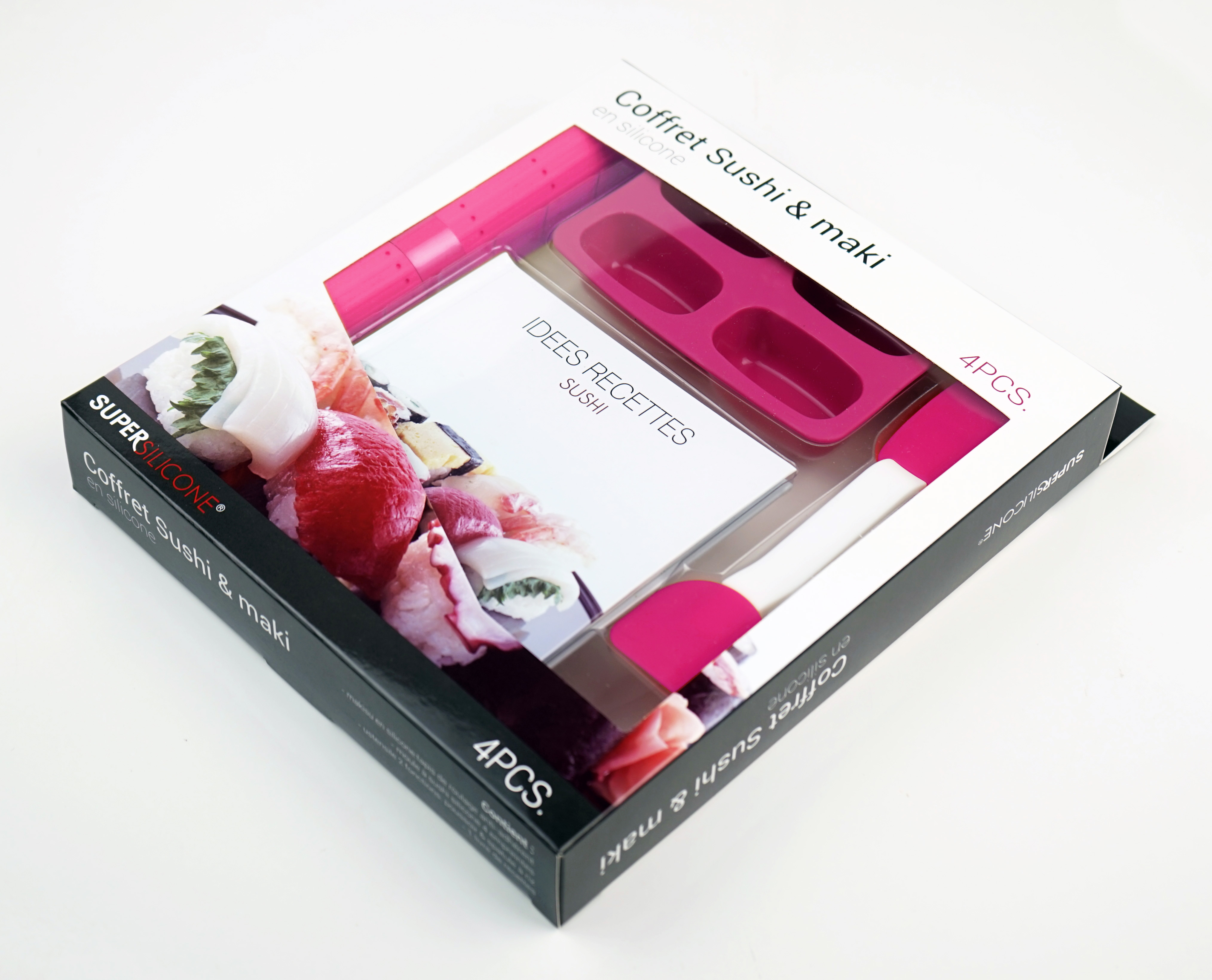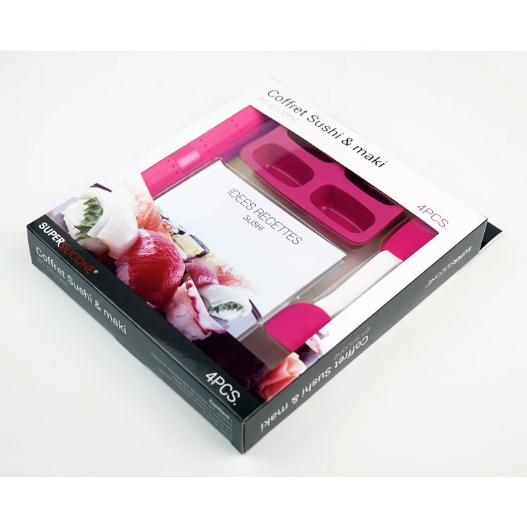Ce coffret fera gagner du temps aux amateurs de sushi et maki. Découvrez ce set 4 pièces en silicone pour réaliser vos sushis avec précisions. Moules silicones anti-adhérents. Livre d'idées recettes inclus.