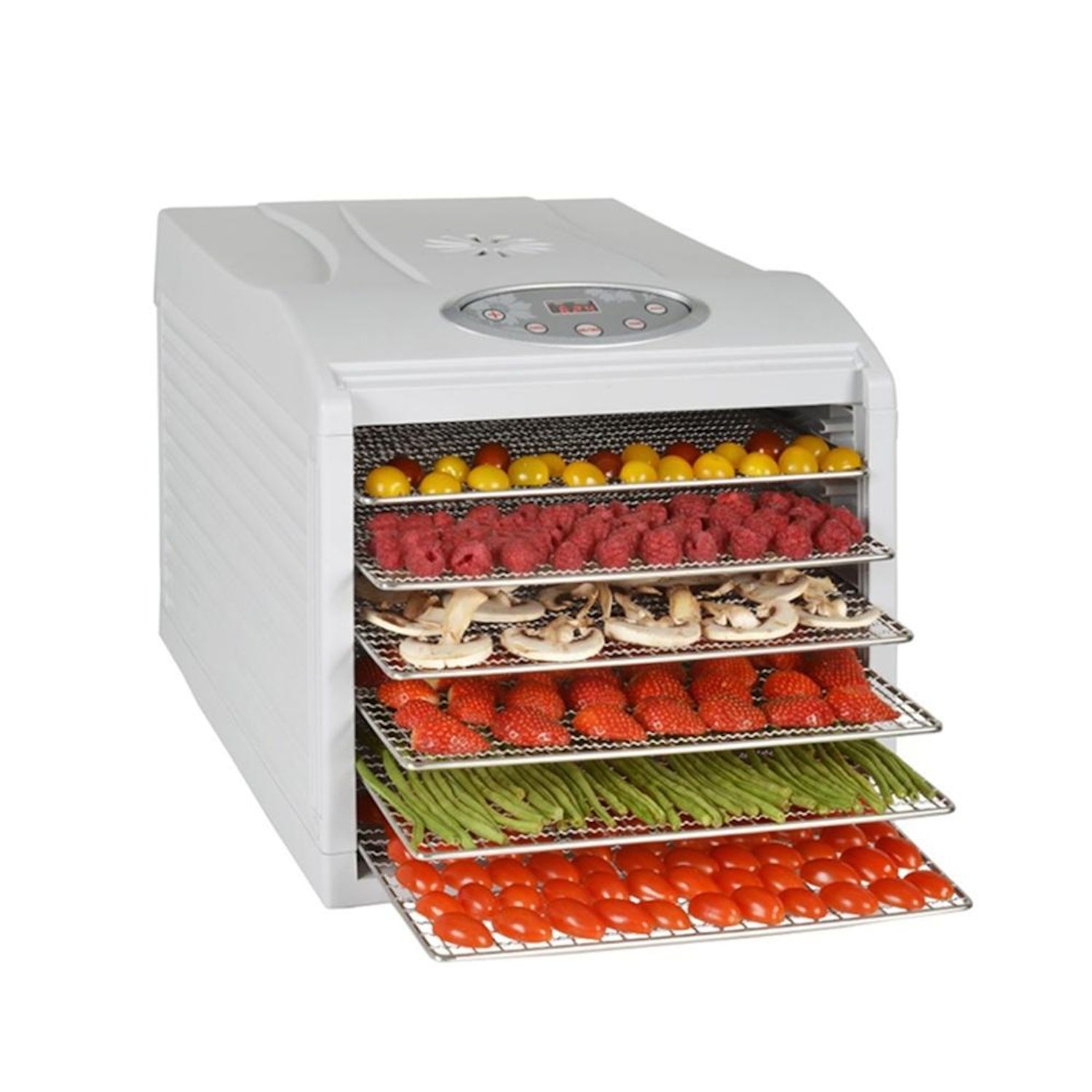 Plateaux: 6 grands plateaux amovibles (33x30cm) d'une surface de séchage de 990cm2 par plateau soit au total 5940cm2
