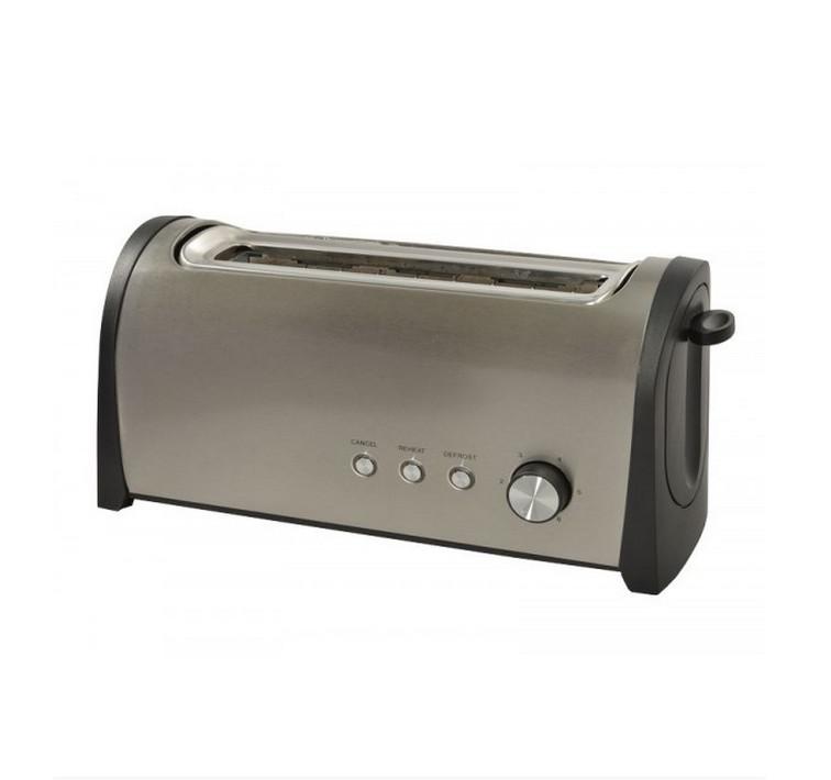 Kitchen Chef KST17SS Toaster Kitchen Chef KST17SS est un grille-pain avec 1 fente (25 cm x 4,2 cm) qui s'adapte à tous les types de pains- Thermostat variable avec 6 niveaux de brunissage.- Fonctions décongélation pour griller directement du pain congelé et réchauffage.