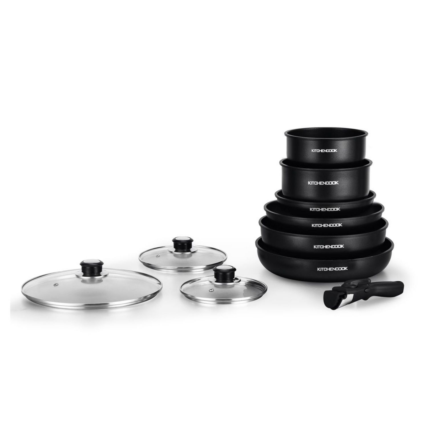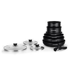 Une batterie de cuisine intelligente qui comprend 3 poêles (diam. 20, 24 et 28 cm), 2 casseroles (diam. 16 et 18 cm) et 1 sauteuse (diam. 26 cm) en aluminium, un matériau très résistant aux chocs et à l'usure, avec revêtement intérieur anti-adhérent pour une cuisine plus saine sans matières grasses et un nettoyage facilité. Une poignée amovible en bakélite (rangement facilité et gain de place appréciable !) et 3 couvercles en verre bien hermétiques complètent l'ensemble. Tous feux dont induction