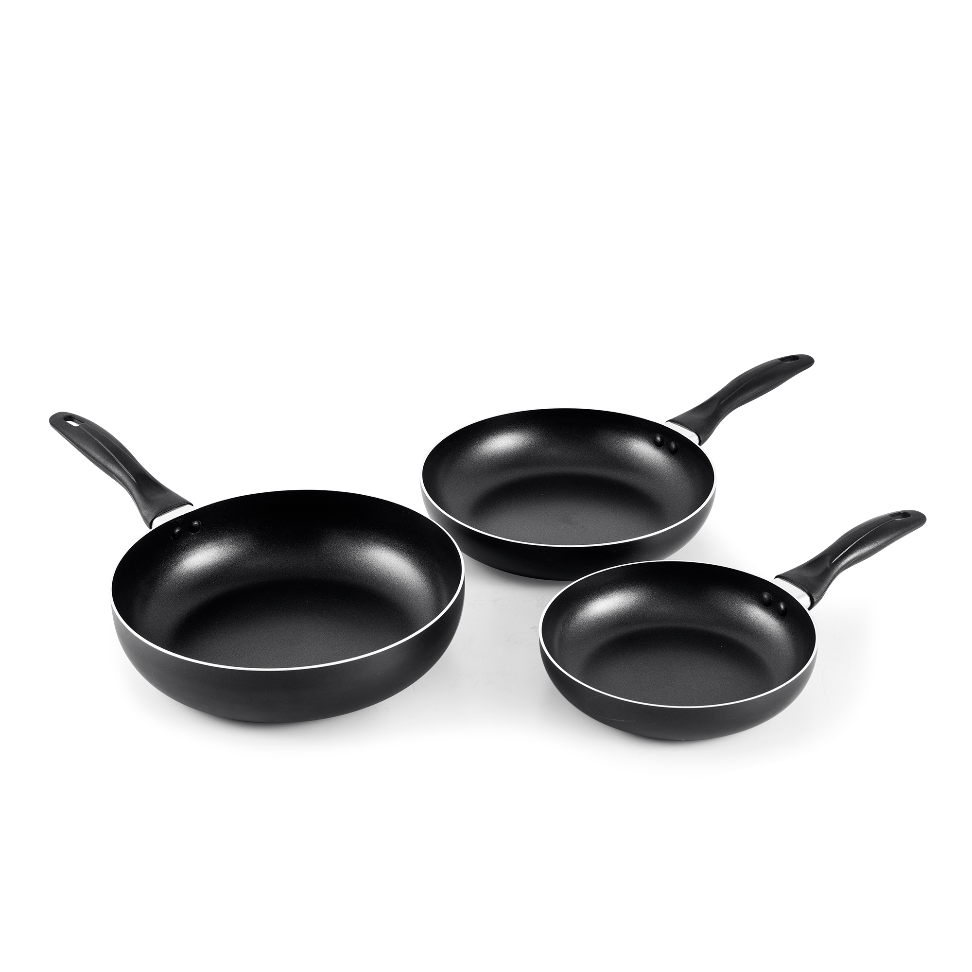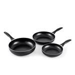 Poêles en aluminium, un matériau très résistant aux chocs et à l'usure. Revêtement intérieur anti-adhérent pour une cuisine plus saine sans matières grasses et un nettoyage facilité. Poignée ergonomique en bakélite agréable au toucher. Vendues par 3 : 1 sauteuse 26 cm et 2 poêles 20 et 24 cm, compatibles tous feux sauf induction.