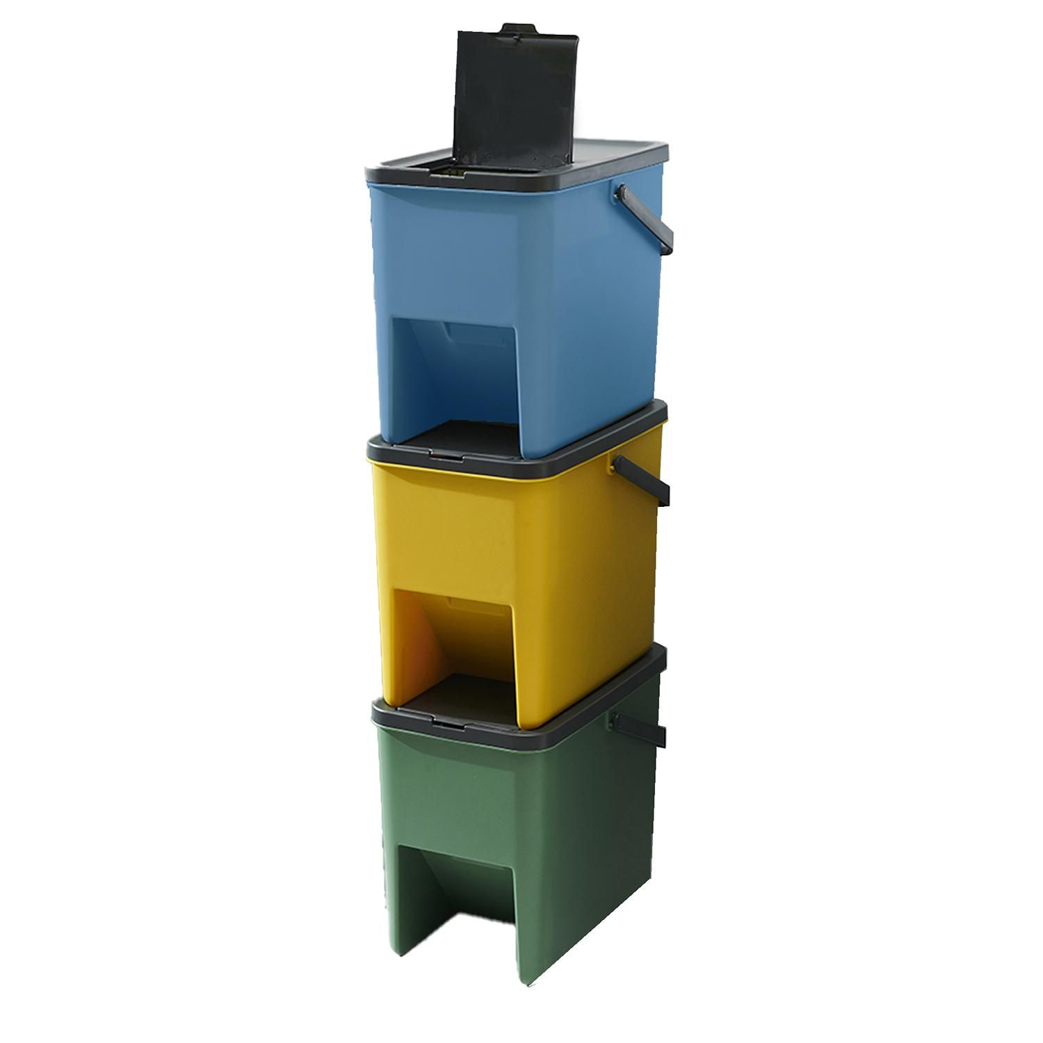Kitchen Move BAT-4XG3730 Comprend des poubelles de couleurs jaune, bleu et vert, idéales pour séparer les différents types de déchets recyclables.Ces poubelles sont conçues pour être empilées, économisant ainsi de l'espace dans votre cuisine, garage ou bureau tout en gardant vos déchets bien organis