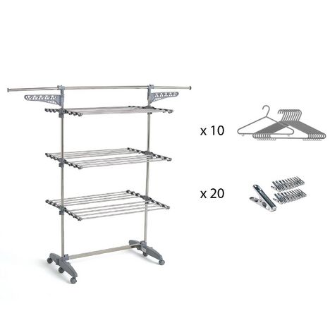 Kitchen Move BAT-TR-22S Séchoir à linge étendoir multifonction 25M EXTRA avec 30 accessoires 3 niveaux Gris et Inox