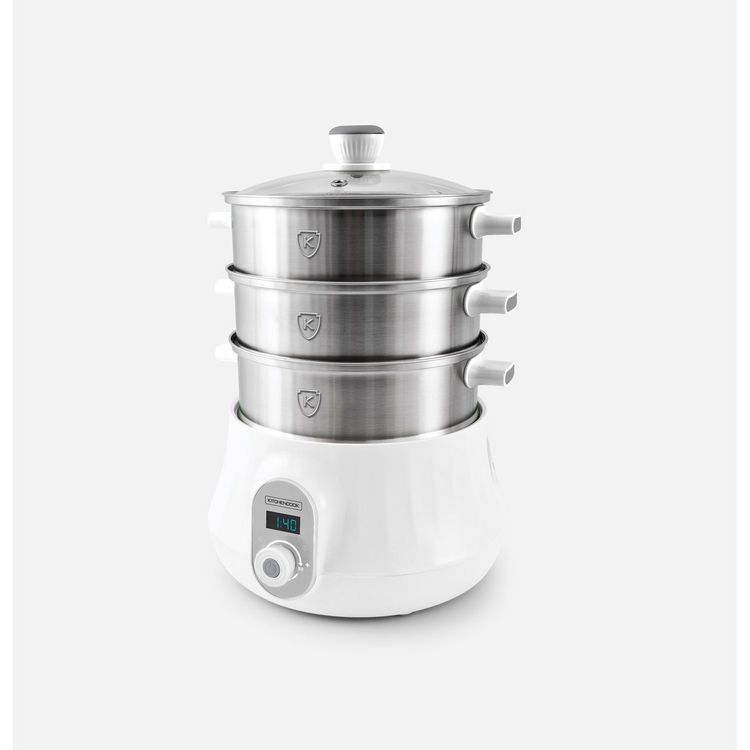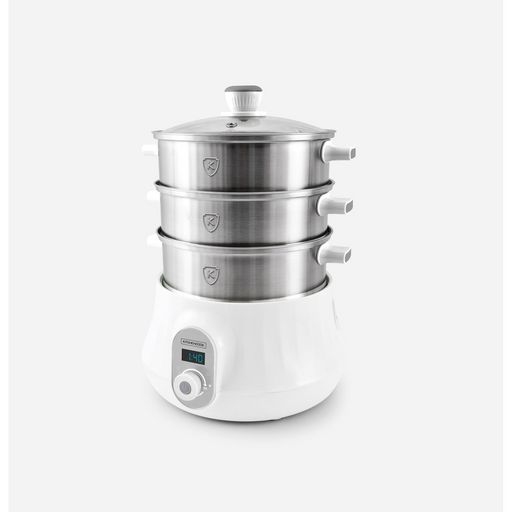 Le cuiseur vapeur multifonction MULTISTEAM 9 de KITCHENCOOK est un appareil électroménager de couleur blanche permettant de cuire à la vapeur différents types d'aliments simultanément grâce à ses 3 paniers vapeur empilables. Il dispose également de plusieurs fonctions telles que la fonction maintien au chaud, la fonction de cuisson du riz et la fonction de cuisson à la vapeur rapide.