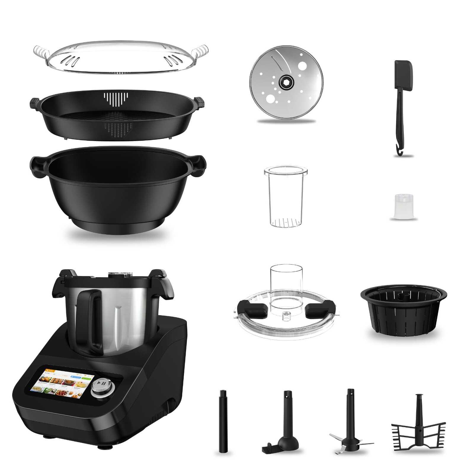 - Accessoires inclus : Verre doseur, bol en acier inoxydable avec 2 couvercles en plastique, panier vapeur, plateau vapeur, fouet, lame en acier inoxydable, spatule en silicone, poussoir, disque à râper/émincer en inox